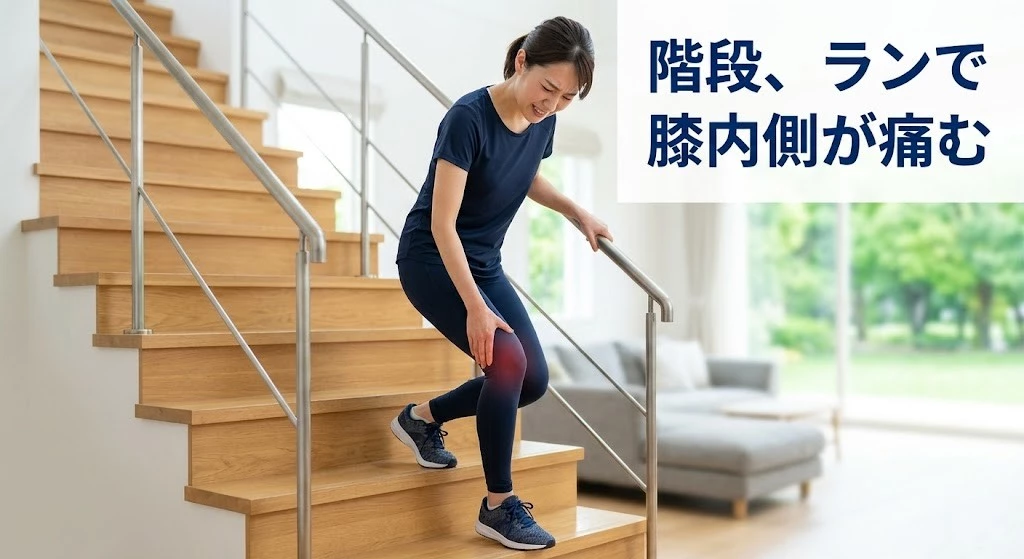 痛みは膝のお皿の少し下、内側のすね寄りに出やすく、階段、立ち上がり、ランニングで悪化しやすいのが特徴です。