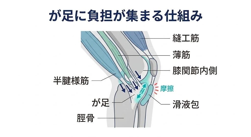 鵞足部には、膝の曲げ伸ばしや下肢の動きにあわせて繰り返し力がかかります。ここで腱や滑液包に摩擦や圧迫が重なると、炎症が起こりやすくなります。