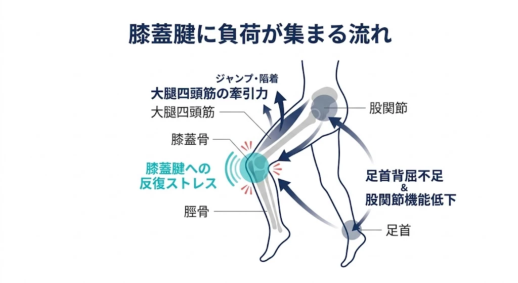 ジャンプや着地では、太ももの前側にある大腿四頭筋が強く働き、その力が膝蓋骨を介して膝蓋腱へ伝わります。この時、腱にかかる負荷が大きくなりすぎたり、回復が追いつかなかったりすると、膝蓋腱の一部にストレスが集中しやすくなります。