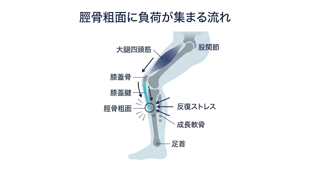 ジャンプ、ダッシュ、キック、急停止などでは、大腿四頭筋が強く収縮します。この力は膝蓋骨を介して膝蓋腱へ伝わり、さらに脛骨粗面を引っ張る方向に働きます。成長期では、この引っ張られる場所が大人より弱いため、繰り返すことで痛みや出っ張りが起こりやすくなります。