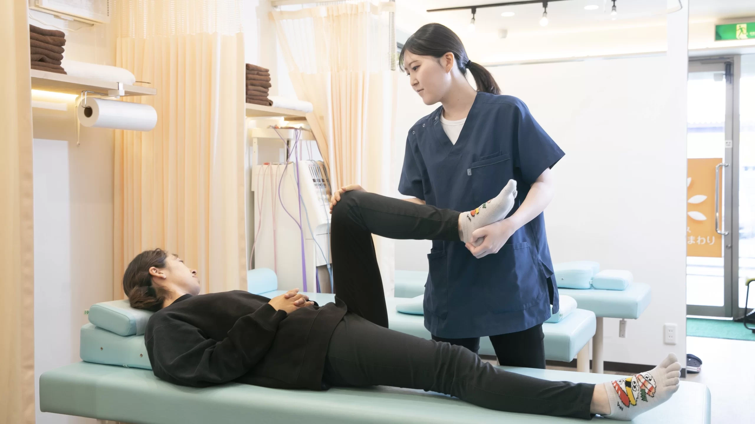 痛みが少し落ち着いてきたら、次は太ももの前、ふくらはぎ、股関節、足首の状態を整理していきます。手技や軽い運動を通して、脛骨粗面だけが引っ張られすぎない状態へつなげます。