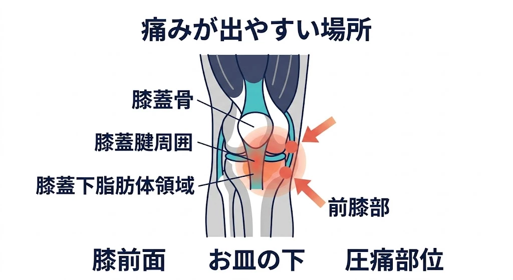 そのため、膝を伸ばし切る動き、膝立ち、ジャンプの着地、ダッシュ、急な方向転換などで繰り返し挟み込まれると、ズキッとした痛みや腫れ感が出やすくなります。痛む場所は膝のお皿の下が中心ですが、膝前面全体が不安になるように感じる方もいます。