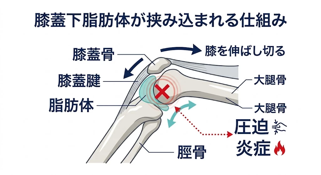 膝蓋下脂肪体は、膝蓋骨の下、膝蓋腱のまわりにあるやわらかい組織です。膝を伸ばし切る時に前方で圧迫されやすく、反復する屈伸や着地の衝撃が加わると、圧迫とこすれが重なって炎症が起きやすくなります。