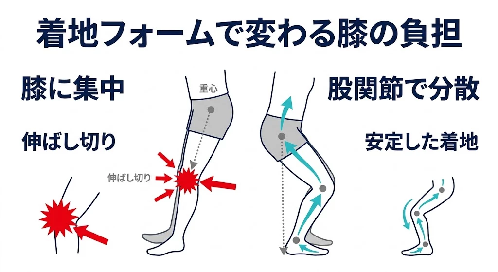 痛む動作を減らしていったん楽になっても、着地で膝を伸ばし切るくせや、股関節で衝撃を受けにくい動きが残っていると、復帰後にまた同じ場所が挟み込まれやすくなります。これが、休むだけでは戻りやすい大きな理由です。