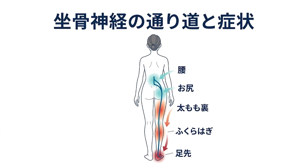 坐骨神経痛は、腰からお尻、太もも、ふくらはぎ、足先へと続く坐骨神経の通り道に沿って、痛みやしびれが出る状態です。つまり、坐骨神経痛そのものが病名というより、何かの原因で神経が刺激されている時に現れる症状の呼び方です。