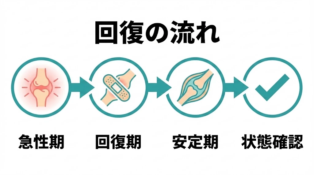 回復のスピードには個人差があります。ここでは、よくある症状の目安を整理します。重要なのは、目安の数字よりも、日常動作での痛み、可動域、しびれなどが残っていないかを確認しながら進めることです。