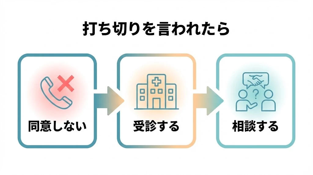 - その場で同意しないことが最優先です。まだ症状が残っていることを伝え、医師の診察で治療継続の必要性を確認します。不安な点や連絡の受け答えは、当院でも状況整理をサポートします。
