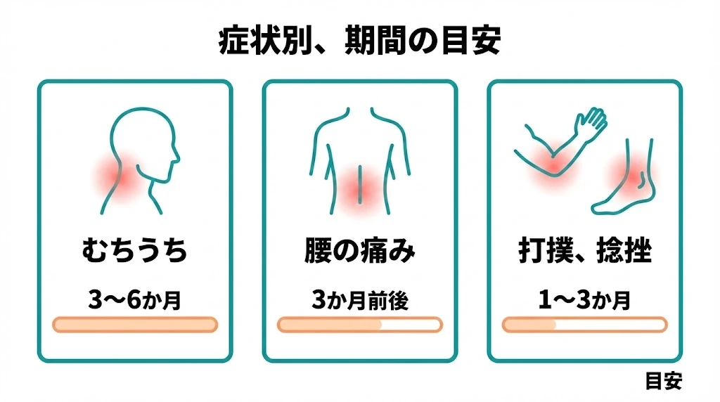 - 症状や回復の経過で変わりますが、むちうちは3か月から6か月、腰の痛みは3か月前後、打撲や捻挫は1か月から3か月が目安です。大切なのは期間の数字よりも、痛み、可動域、しびれ、頭痛などが残っていないかを確認しながら進めることです。