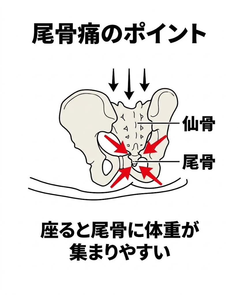 - 姿勢のくせ。浅く座る座り方が続くなど、尾骨に力が集まり続けてつらさが続くことがあります。