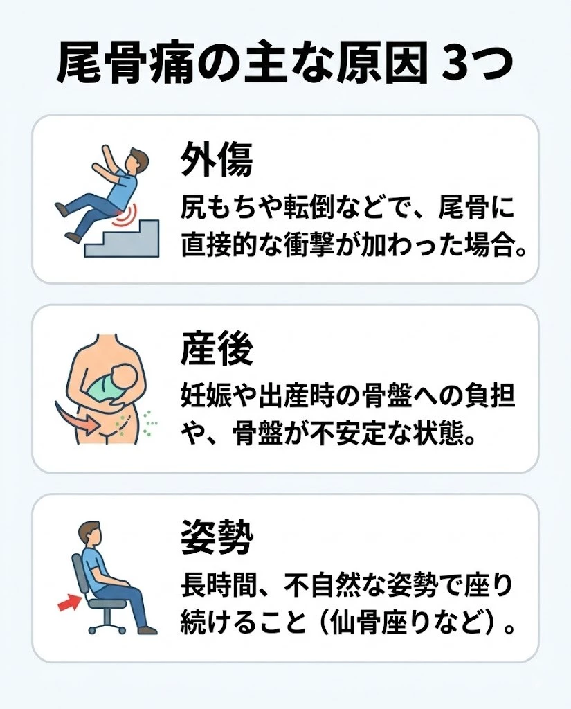 - 産後、骨盤への負担。妊娠や出産の負担が重なり、尾骨まわりが過敏になることがあります。