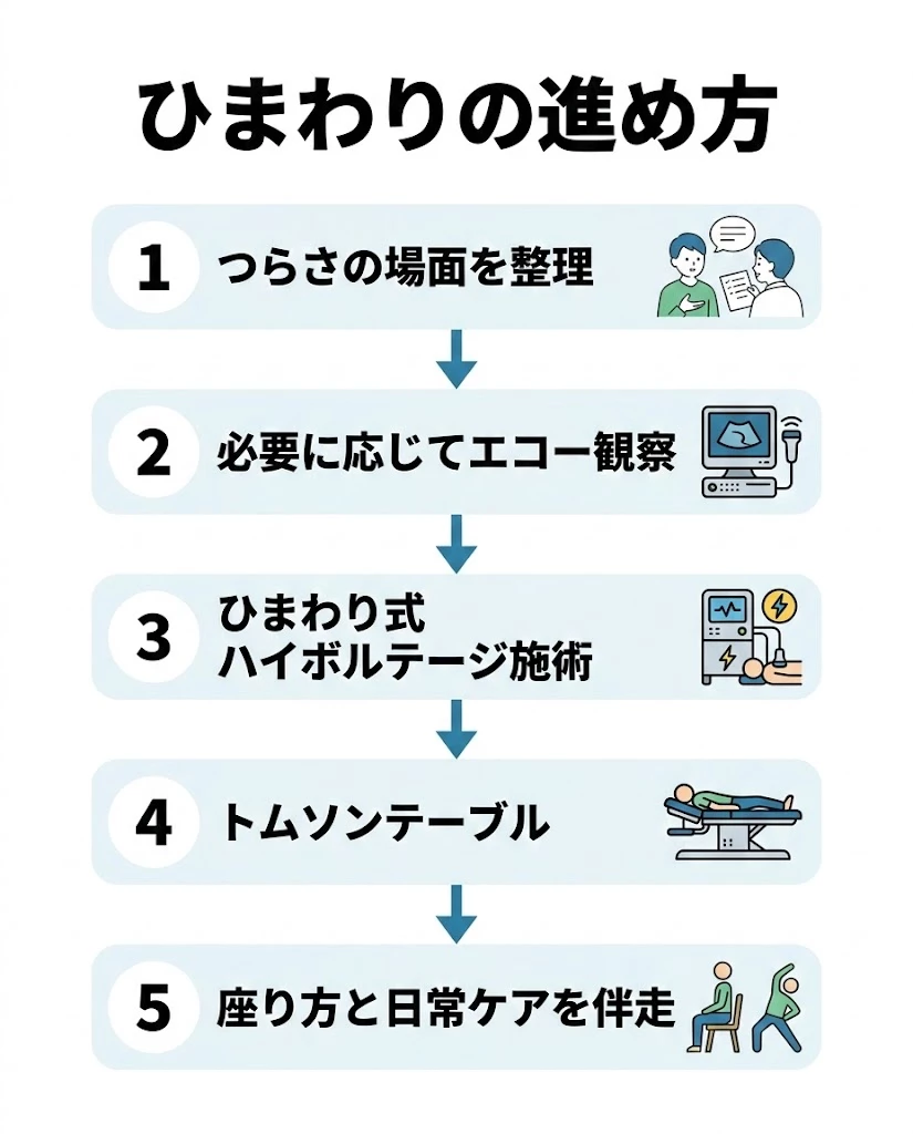 当院ではプライバシーに配慮しながら、国家資格者が安全面を大切に確認します。どこが痛みを拾っているかを見立て、必要に応じてエコー観察やひまわり式ハイボルテージ施術の反応も参考にしつつ、尾骨に負担が集まりにくい身体の使い方へつなげていきます。