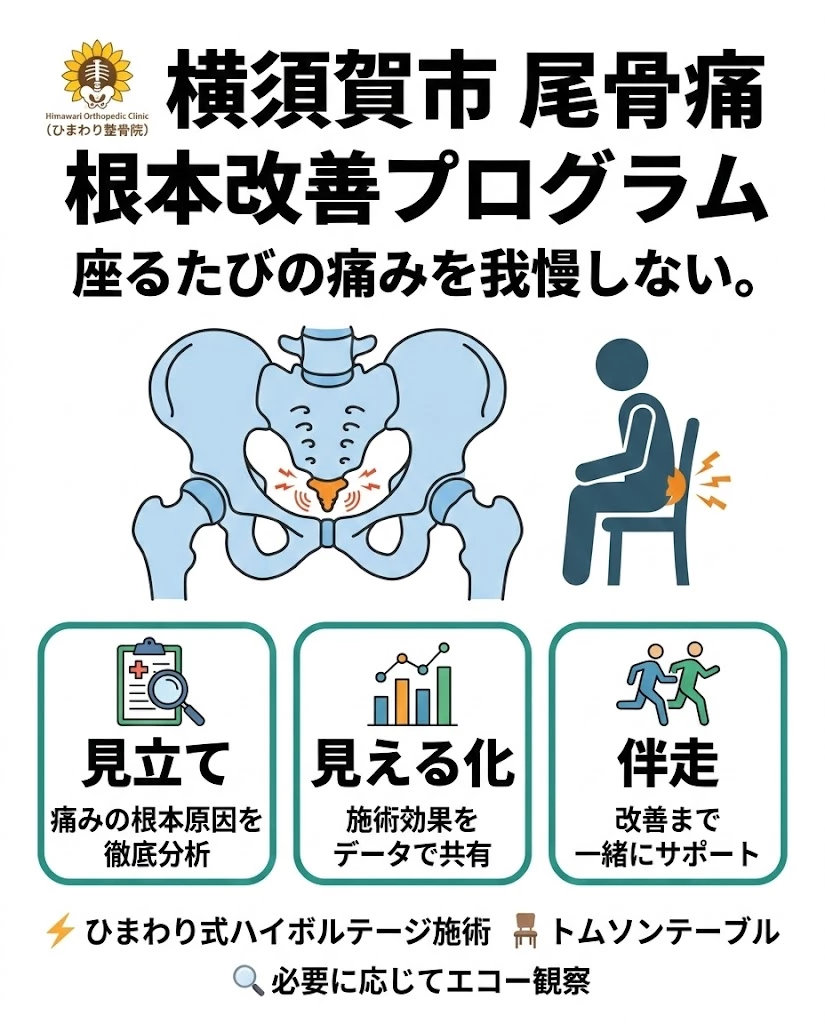 表面をほぐすだけだと、尾骨の周りで負担を受けている靭帯や深い筋肉の問題が残り、戻りやすいことがあります。鍼灸整骨院ひまわり北久里浜院、鍼灸整骨院ひまわり衣笠院では、まず痛みの出ている場所を見立て、座り方や日常動作まで含めて整えていきます。