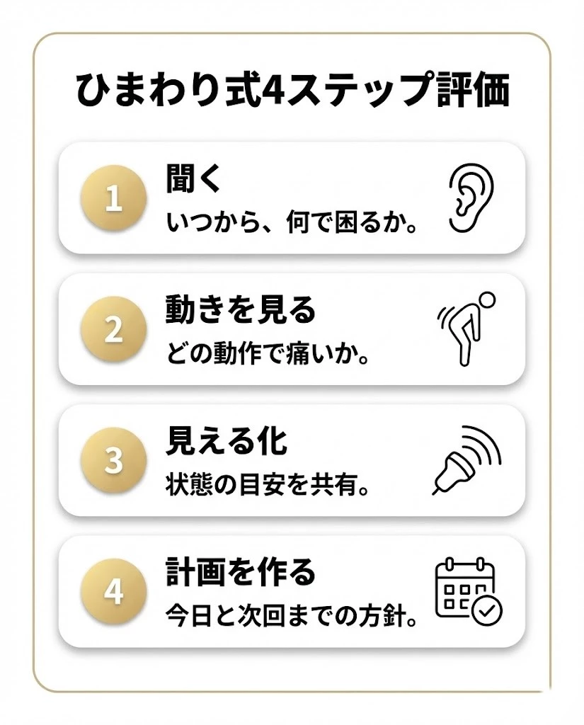 痛い場所だけで決めつけず、どの動きで痛むかから負担の集まり方を見立てます。今日できることと次回までの注意点を先に整理します。