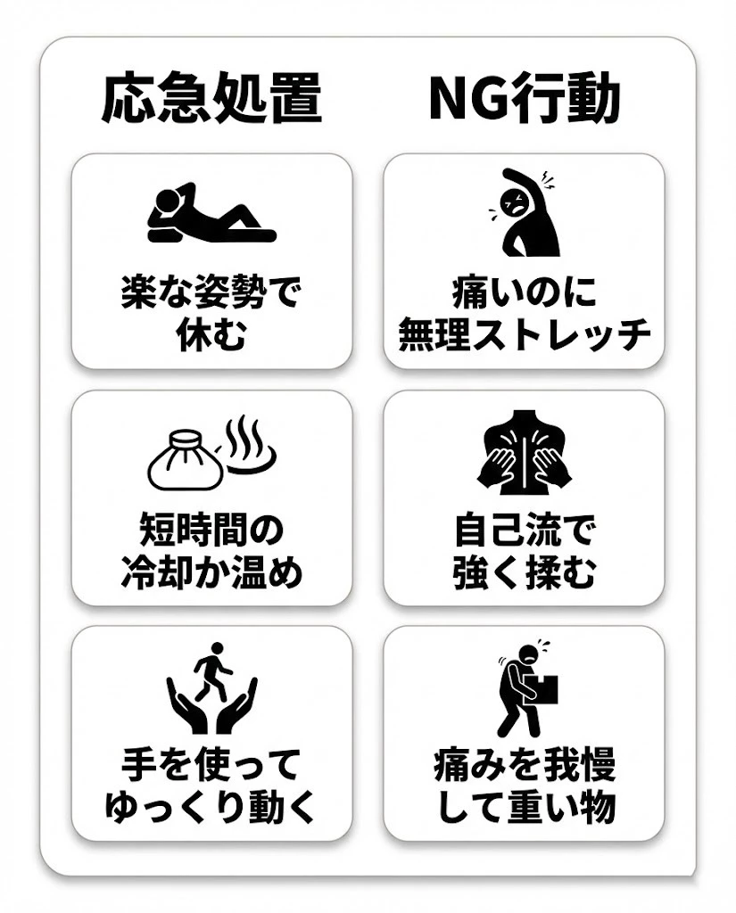 ぎっくり腰は、最初の動き方でつらさが変わることがあります。今すぐできることと、避けたいことを整理します。