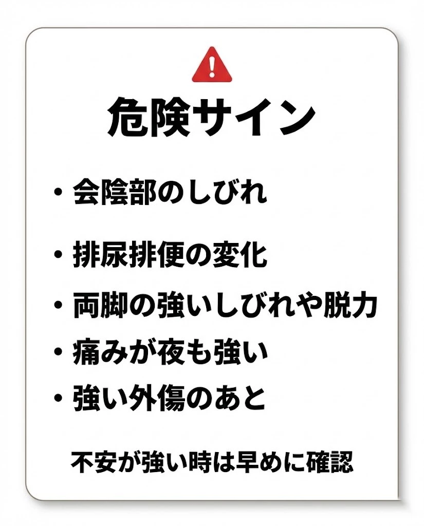 特に、しびれや力の入りにくさ、排尿排便の変化がある時は、我慢せずに早めに確認しましょう。