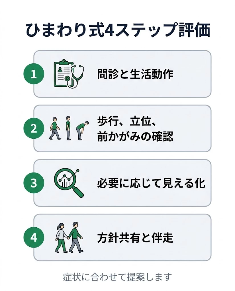 - 当院は、痛い場所より動作から整理します。歩行、立位、前かがみ、休憩での変化を確認します。