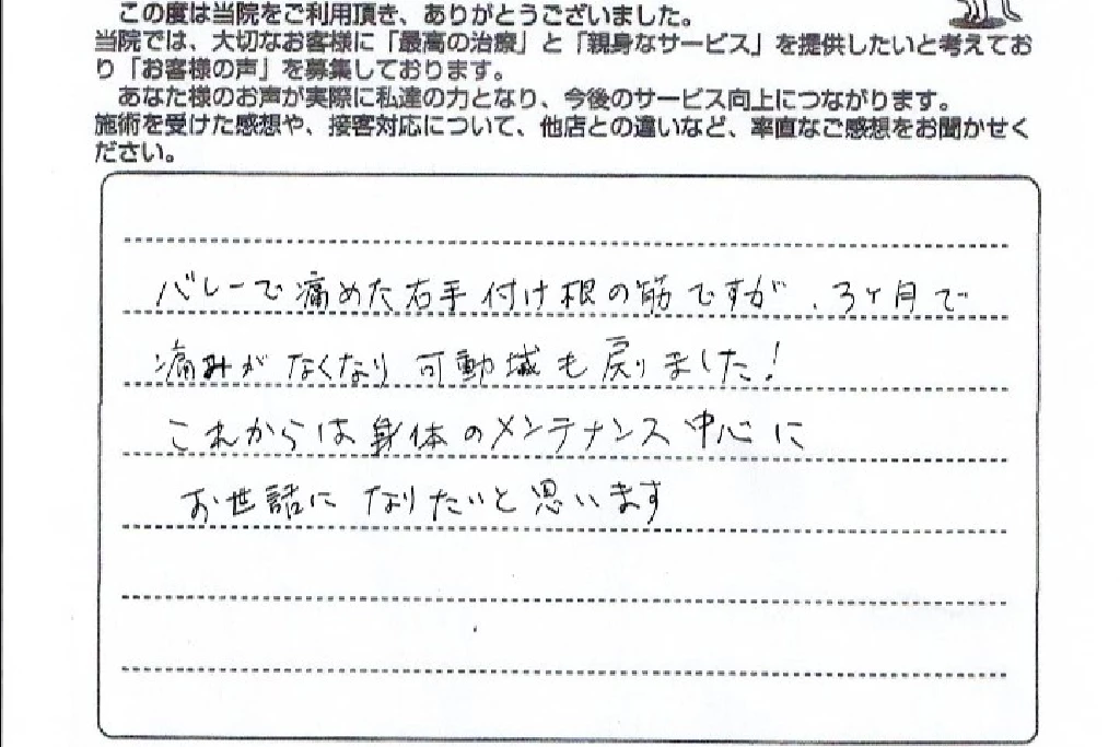- A1: 損傷タイプ(外傷性/変性)や負荷量により異なります。適切な初期対応で数週間〜数ヶ月を目安に段階的に改善を図ります。
