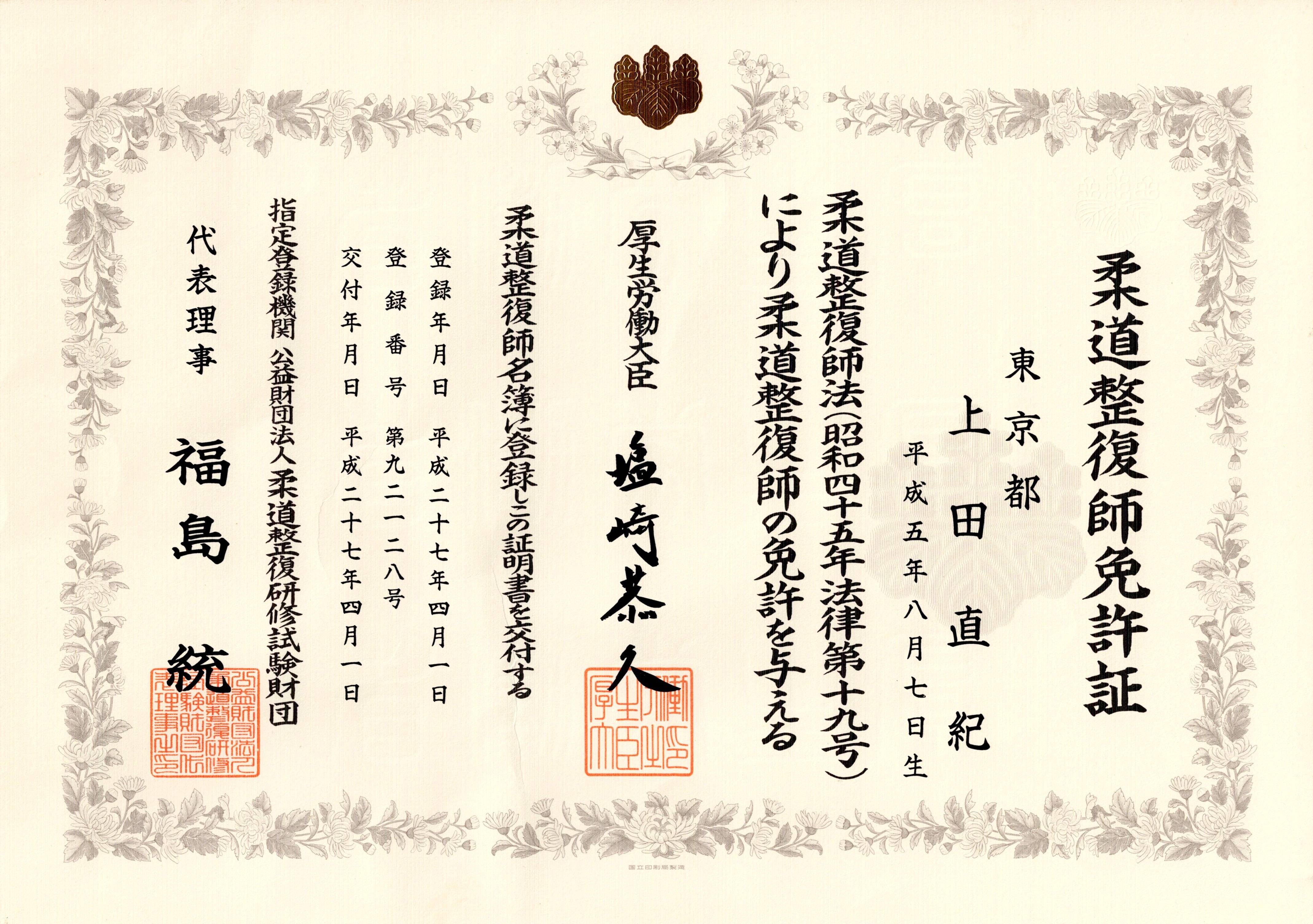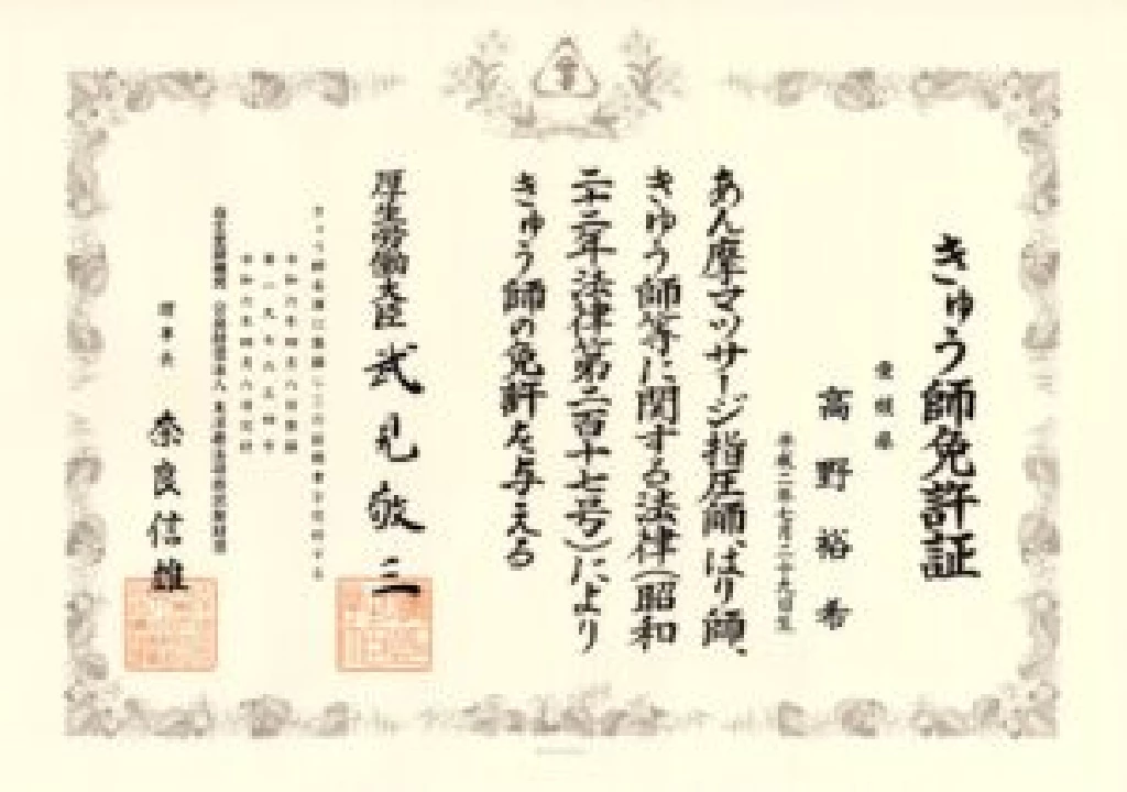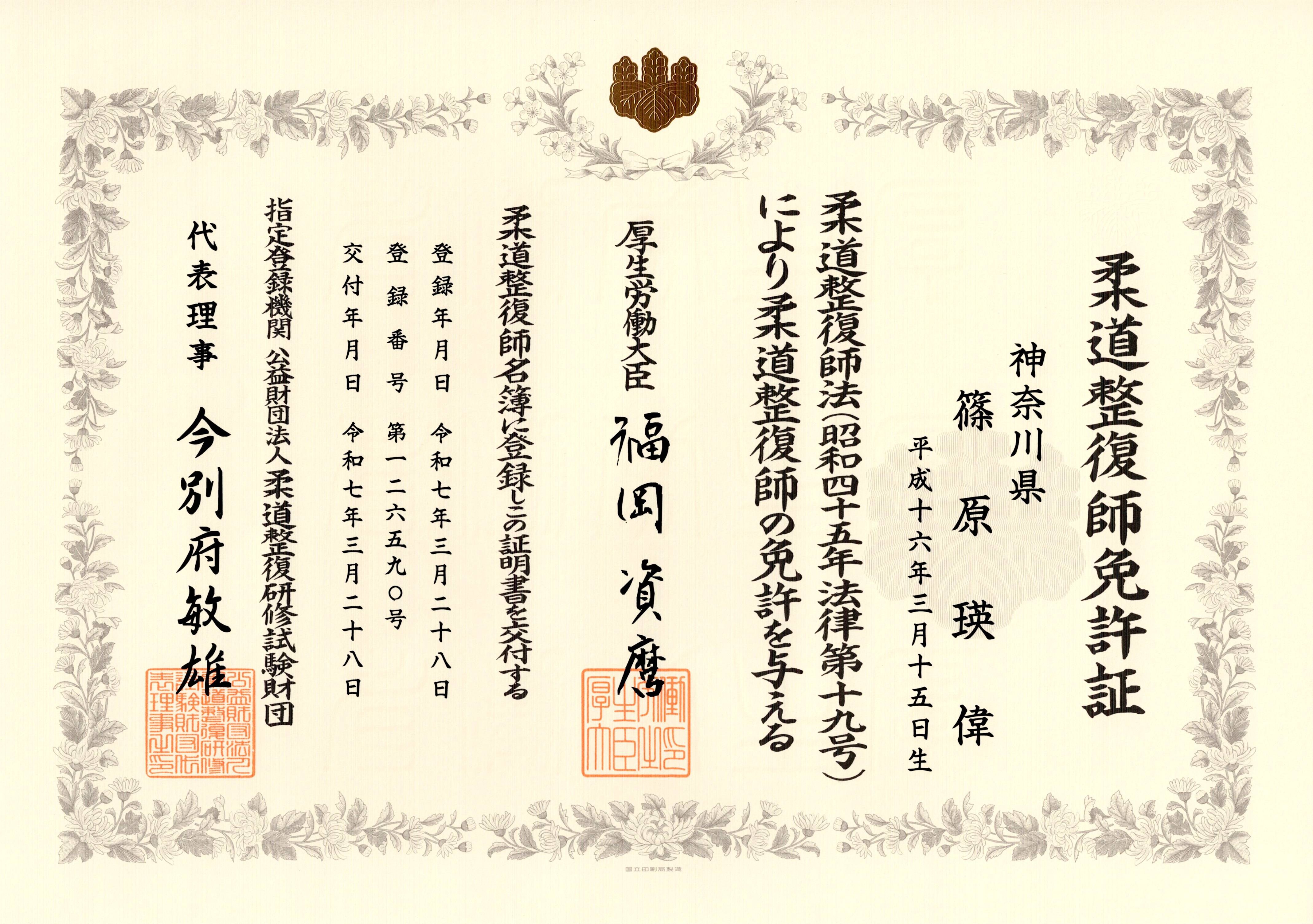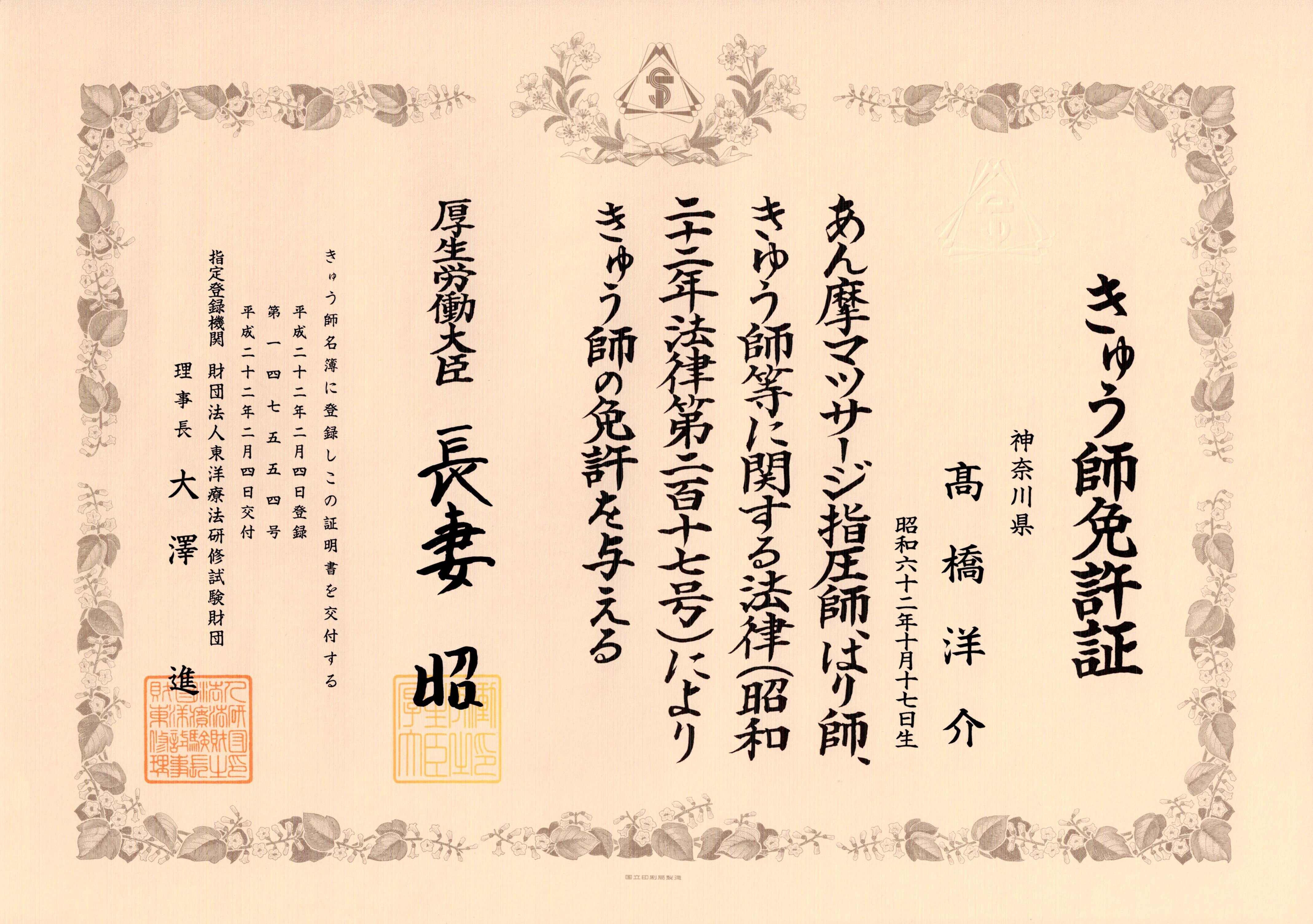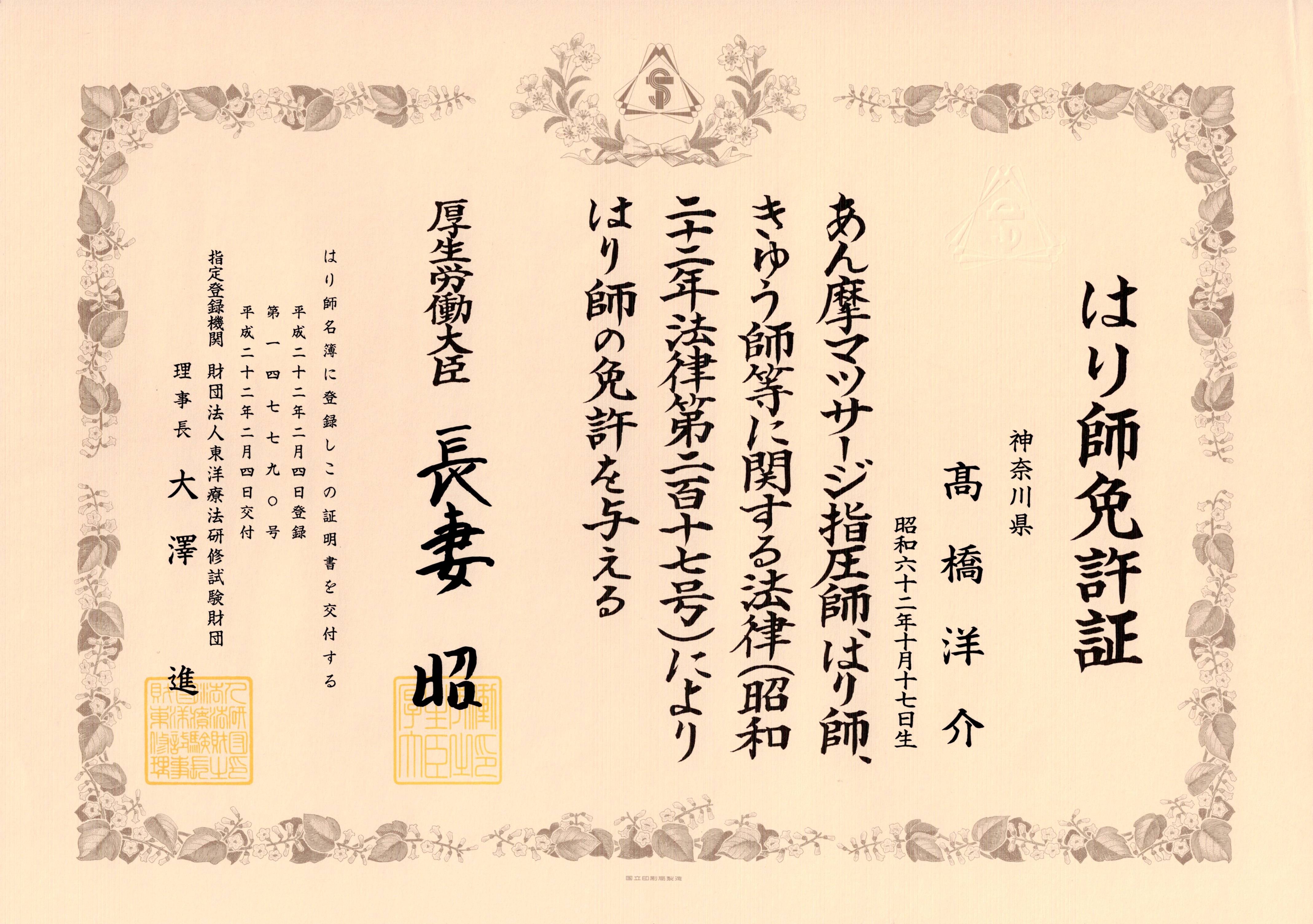 ですが高校生の時に部活で度重なる怪我や手術をし、接骨院、リハビリテーション病院等の施術を受けるにつれて自分も運動を教える立場から、運動や日常生活等で努力している人たちを支えれるようになりたいと思い、高校を卒業して直ぐに地元横須賀にある神奈川衛生学園専門学校に入学し、はり師、きゅう師、あん摩マッサージ指圧師の国家資格を取得しました。
